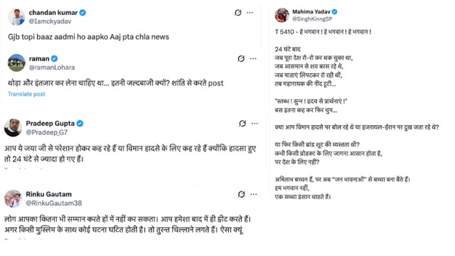 वहीं एक दूसरे यूजर ने लिखा कि हे भगवान ! हे भगवान ! हे भगवान ! 24 घंटे बाद। जब पूरा देश रो-रो कर थक चुका था, जब आसमान से शव बरस रहे थे,जब माताएं लिपटकर रो रही थीं, तब महानायक की नींद टूटी...स्तब्ध ! सुन्न ! हृदय से प्रार्थनाएं ! बस इतना कह कर फिर चुप...क्या आप विमान हादसे पर बोल रहे थे या इजरायल-ईरान पर दुख जता रहे थे? या फिर किसी ब्रांड शूट की व्यस्तता थी? कभी किसी प्रोडक्ट के लिए जागना आसान होता है, पर देश के लिए नहीं? अमिताभ बच्चन हैं, पर अब “जन भावनाओं” से बच्चा बना बैठे हैं. हम भगवान नहीं, एक सच्चा इंसान चाहते हैं.