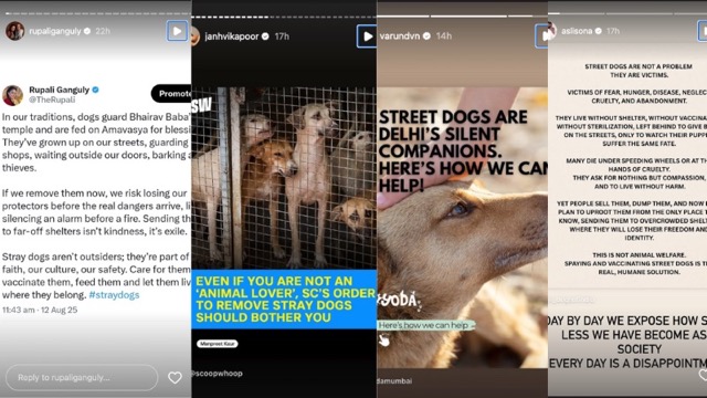 बॉलीवुड और टीवी इंडस्ट्री के कई सितारों ने आवारा कुत्तों पर सुप्रीम कोर्ट के फैसले पर नाराजगी जताई है और इसे अमानवीय बताया है. सोनाक्षी सिन्हा, जीनत अमान, रूपाली गांगुली और श्रिया पिलगांवकर समेत कई हस्तियों ने सोशल मीडिया पर अपनी बातें रखीं.