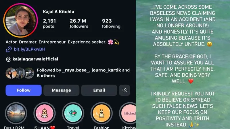 इन अफवाहों के बीच काजल अग्रवाल ने अपने सोशल मीडिया अकाउंट पर एक स्पष्ट संदेश साझा किया. उन्होंने लिखा, “मैं पूरी तरह सुरक्षित हूं. कृपया इस तरह की झूठी बातों पर विश्वास न करें और न ही इन्हें आगे बढ़ाएं. हमें निगेटिव चीजों से हटकर पॉजिटिव और सच्ची बातों पर ध्यान देना चाहिए.''