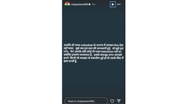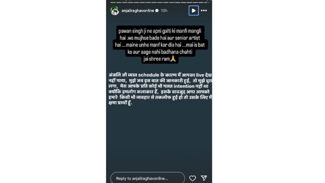 वहीं अब मामला बढ़ता देख पवन सिंह ने अंजलि राघव से माफी मांग ली है. पवन सिंह ने अपनी इंस्टाग्राम स्टोरी पर लिखा, “अंजलि जी बिजी शेड्यूल के कारण मैं आपका लाइव देख नहीं पाया. मुझे जब इस बात की जानकारी हुई तो मुझे बुरा लगा. मेरा आपके प्रति कोई भी गलत इंटेंशन नहीं था. क्योंकि हमलोग कलाकार हैं, इसके बावजूद अगर आपको हमारे किसी भी व्हवहार से तकलीफ हुई हो तो उसके लिए भी क्षमा प्रार्थी हूं.”