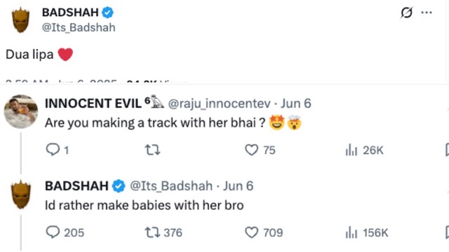 दरअसल बादशाह ने अपने एक्स अकाउंट पर दुआ लीपा लिखा था. इसके साथ ही उन्होंने एक हार्ट इमोजी बनाई थी. बादशाह के इस पोस्ट के बाद लोग तरह तरह की बातें करने लगे. किसी ने कहा कि वो दुआ लीपा के साथ कोई नया गाना लेकर आ रह हैं, तो किसी ने डेटिंग की बात कह दी. वहीं एक शख्स ने बादशाह से कमेंट में पूछा कि क्या आप दुआ के साथ कोलैब करने जा रहे हो?’ इस सवाल के जवाब में बादशाह ने एक ऐसी बात कह दी, जिसके बाद सिंगर का बयान वायरल हो गया. फैन के कॉमेंट के जवाब में बादशाह ने लिखा- ‘मैं उनके साथ बच्चे पैदा करना चाहुंगा’.