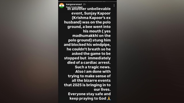 संजय कपूर के निधन पर अब बॉलीवुड एक्ट्रेस और बीजेपी सांसद कंगना रनौत ने भी अपनी प्रतिक्रिया दी है. कंगना ने इसे दुखद और अविश्वसनीय करार दिया है. कंगना ने अपनी इंस्टाग्राम स्टोरी के ज़रिए करिश्मा के पूर्व पति संजय के निधन पर लिखा “एक और यकीन ना होने वाले हादसे में, संजय कपूर (करिश्मा कपूर के एक्स हसबैंड) पोलो ग्राउंड पर थे, एक मधुमक्खी उनके मुंह में चली गई (हां, पोलो ग्राउंड पर मधुमक्खी) और उन्हें डंक मार दिया और उनकी सांस की नली बंद हो गई. वे सांस नहीं ले पा रहे थे इसलिए उन्होंने खेल को रोकने के लिए कहा लेकिन तुरंत ही कार्डियक अरेस्ट से उनका निधन हो गया. बहुत दुख भरी खबर. इसके अलावा मैं 2025 में हमारी जिंदगी में आने वाली सभी अजीबोगरीब घटनाओं को लेकर सेंस लगाने की कोशिश कर रही हूं. सभी सुरक्षित रहें और भगवान से प्रार्थना करते रहें.”