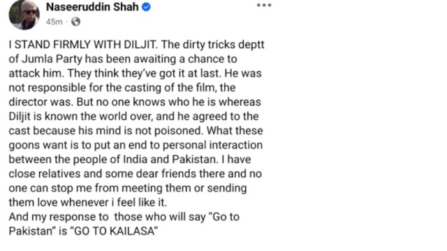 दरअसल, नसीरुद्दीन शाह ने 'सरदार जी 3' में पाकिस्तानी एक्ट्रेस हानिया आमिर की मौजूदगी को लेकर विवादों में फंसे दिलजीत दोसांझ का समर्थन किया था. उन्होंने अपने फेसबुक पोस्ट में लिखा था, "मैं दिलजीत के साथ पूरी मजबूती से खड़ा हूं. जुमला पार्टी का 'डर्टी ट्रिक्स डिपार्टमेंट' बहुत समय से दिलजीत पर हमला करने का मौका ढूंढ रहा था. अब उन्हें लगता है कि आखिरकार वो मौका मिल गया है.''