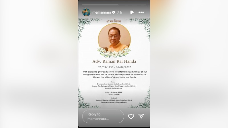 मन्नारा चोपड़ा ने अपने आधिकारिक इंस्टाग्राम अकाउंट के जरिए अपने पिता के निधन की पुष्टि की. उन्होंने अपने पिता की एक तस्वीर साझा करते हुए लिखा:“अत्यंत दुख और भारी मन से हम आपको सूचित करते हैं कि हमारे प्रिय पिता, जो हमारे जीवन की ताकत और प्रेरणा थे, अब हमारे बीच नहीं रहे. उनका निधन 16 जून 2025 को हुआ.”