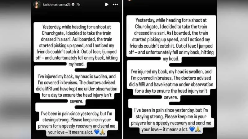 करिश्मा ने फैंस से दुआएं और प्यार भेजने की अपील करते हुए लिखा “मुझे दर्द हो रहा है, लेकिन मैं स्ट्रॉन्ग हूं. कृपया मेरे जल्द ठीक होने की प्रार्थना करें.”