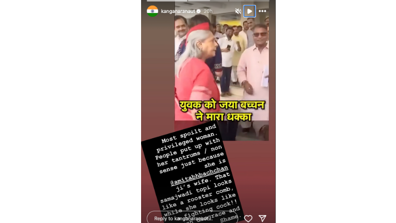 वहीं अब जया बच्चन के इस वायरल वीडियो पर एक्ट्रेस और बीजेपी सांसद कंगना रनौत ने अपनी प्रतिक्रिया दी है. कंगना ने अपनी इंस्टाग्राम स्टोरी पर एक पोस्ट शेयर किया है, उन्होंने जया बच्चन के वायरल वीडियो को शेयर करते हुए लिखा, “सबसे 'बिगड़ैल' और प्रिविलेज महिला. लोग उनके नखरे सिर्फ इसलिए बर्दाश्त करते हैं, क्योंकि वे अमिताभ बच्चन जी की पत्नी हैं. उनके सिर पर रखी समाजवादी टोपी मुर्गे की कलगी की तरह लग रही है और जया खुद लड़ाकू मुर्गे की तरह. कितने अपमान और शर्म की बात है.”