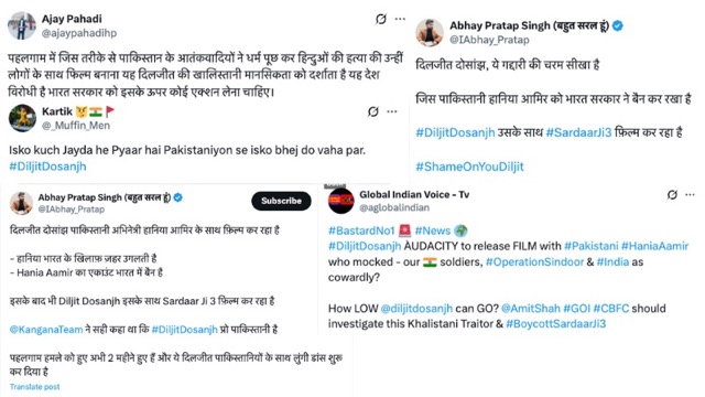 सोशल मीडिया पर दिलजीत के खिलाफ तीखी प्रतिक्रियाएं देखने को मिल रही हैं. कुछ यूजर्स ने उनकी देशभक्ति पर सवाल उठाए, तो कुछ ने उन्हें खालिस्तानी समर्थक तक करार दिया. एक यूजर ने लिखा, “पहलगाम में पाकिस्तानी आतंकियों ने जिस तरह धर्म पूछकर हिंदुओं की हत्या की, उनके साथ फिल्म बनाना दिलजीत की खालिस्तानी मानसिकता को दर्शाता है. यह देश-विरोधी है. भारत सरकार को इनके खिलाफ कार्रवाई करनी चाहिए.”
