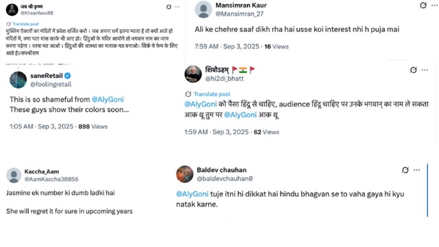 वहीं एक और यूजर ने लिखा, “मुस्लिम ऐक्टरों का मंदिरों में प्रवेश वर्जित करो. जब अपना धर्म इतना प्यारा है तो क्यों आते हो मंदिरों में, क्या पता मांस खाके भी आए हो. हिंदुओं के मंदिर आयोगे तो भगवान नाम का जाप करना पड़ेगा. वरना मत आओ. हिंदुओं की आस्था का मज़ाक मत बनाओ. सिर्फ़ ये फेम के लिए आते है. जयश्रीराम.”