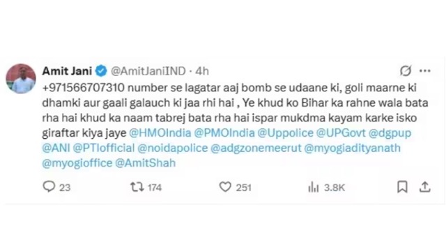 अमित जानी ने अपनी पोस्ट में लिखा, “971566707310 नंबर से लगातार आज बम से उड़ाने की, गोली मारने की धमकी और गाली गलौच की जा रही है, ये खुद को बिहार का रहने वाला बता रहा है, खुद का नाम तबरेज बता रहा है. इसपर मुकद्दमा कायम करके इसको गिरफ्तार किया जाए.”