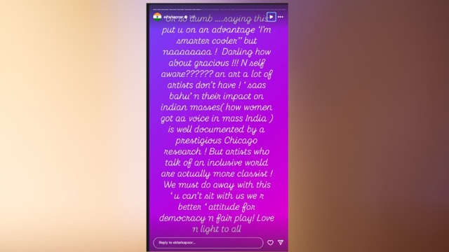 एकता कपूर ने आगे लिखा, "जो कलाकार बराबरी और सबको साथ लेकर चलने की बातें करते हैं, असल में वही ज्यादा ऊंच-नीच वाली सोच रखते हैं. हमें ये 'तुम हमारे साथ नहीं बैठ सकते, हम तुमसे बेहतर हैं' वाली सोच को खत्म करना चाहिए, तभी लोकतंत्र और इंसाफ सही मायनों में काम करेगा. सभी को प्यार.’’