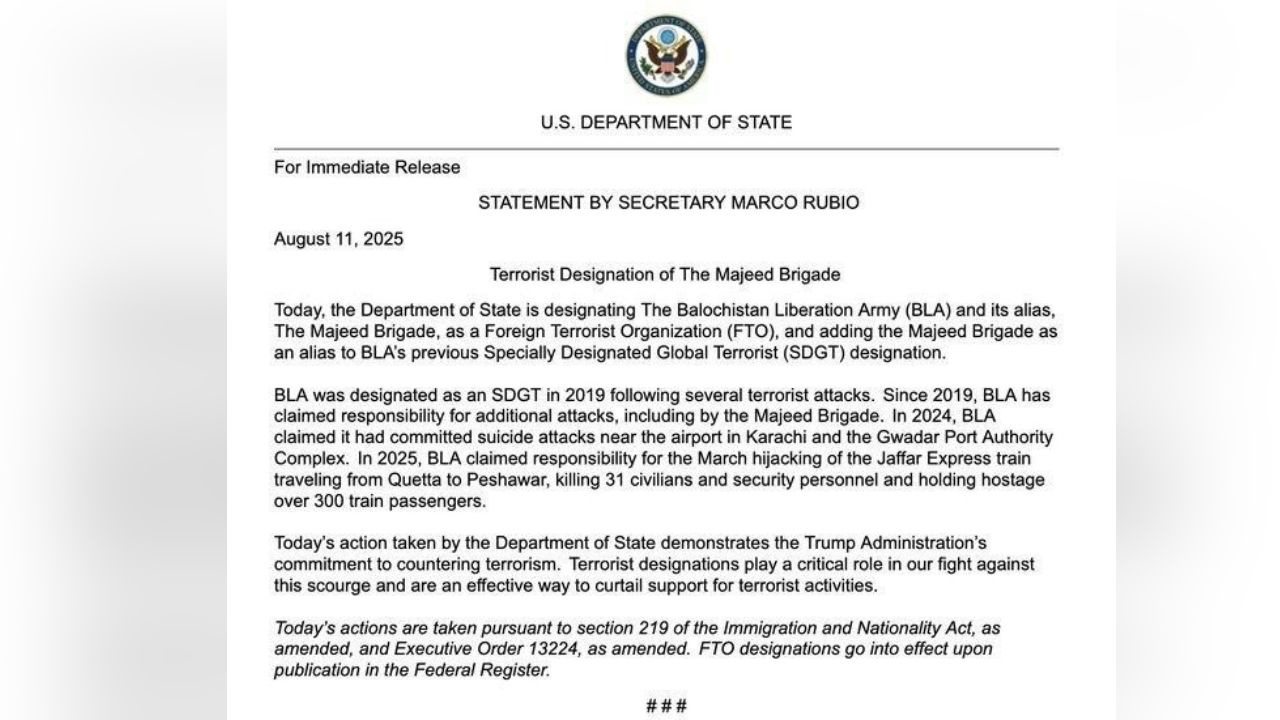 मजीद ब्रिगेड के नाम से भी जाना जाने वाला यह गुट पाकिस्तान के दक्षिण-पश्चिमी प्रांत बलूचिस्तान में सक्रिय है, जिसकी सीमाएं उत्तर में अफगानिस्तान और पश्चिम में ईरान से लगती हैं. BLA पिछले कई वर्षों से एक स्वतंत्र बलूचिस्तान के लिए संघर्ष कर रहा है और कई आत्मघाती हमलों की ज़िम्मेदारी ले चुका है. अमेरिका का यह कदम क्षेत्रीय सुरक्षा और भू-राजनीतिक संतुलन के लिहाज़ से अहम माना जा रहा है.