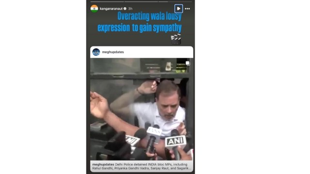 हिमाचल प्रदेश की मंडी लोकसभा सीट से सांसद और फेमस बॉलीवुड एक्ट्रेस और कंगना रनौत ने राहुल गांधी की तस्वीर साझा करते हुए कहा कि सहानुभूति पाने के लिए उन्होंने इस तरह की ओवरएक्टिंग की. कंगना रनौत ने अपने इंस्टाग्राम स्टोरी राहुल पर एक न्यूज को साझा करते हुए लिखा, 'सहानुभूति पाने के लिए ओवरएक्टिंग वाला बुरा एक्सप्रेशन.'