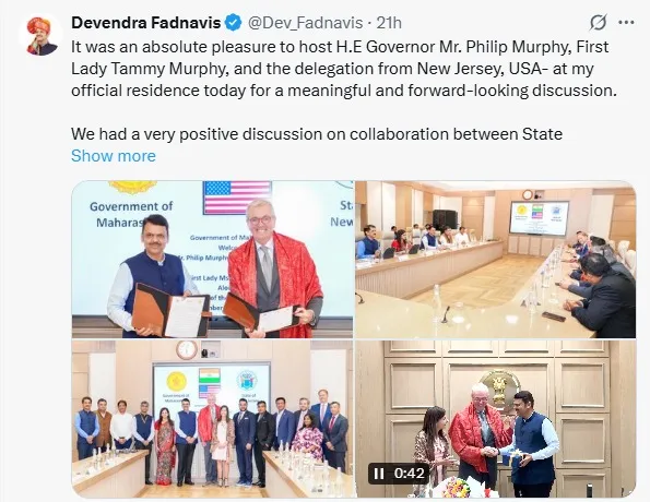 सीएम फडणवीस ने एक अन्य एक्स पोस्ट में फिलिप मर्फी के साथ अपनी तस्वीर पोस्ट की, जिसमें फिलिप मर्फी वडा पाव खाते नजर आए. सीएम फडणवीस ने इस पोस्ट के कैप्शन में लिखा, गवर्नर के साथ वडा पाव का पल. गौरतलब है कि महाराष्ट्र देश का एक अग्रणी औद्योगिक, शैक्षणिक और सांस्कृतिक राज्य है, जबकि न्यू जर्सी अमेरिका के उन राज्यों में है जो शिक्षा, हेल्थकेयर और नवाचार के क्षेत्र में अग्रणी माने जाते हैं.