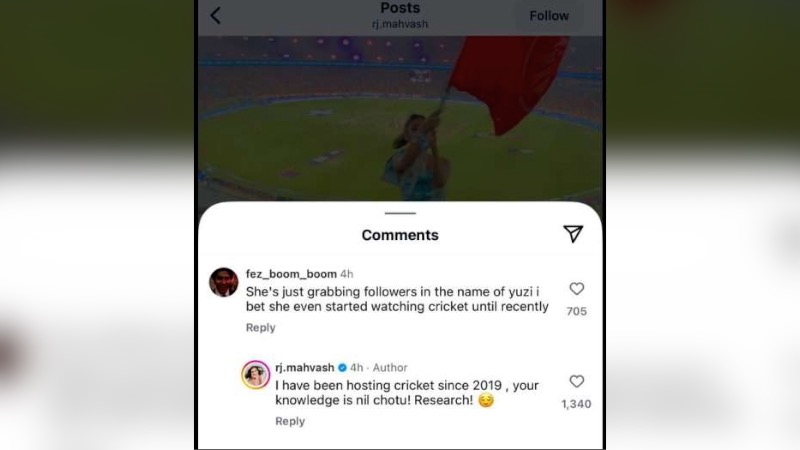 इस कमेंट का करारा जवाब देते हुए महवश ने लिखा:"मैं 2019 से क्रिकेट की मेजबानी कर रही हूं, तुम्हारा ज्ञान शून्य है छोटू! रिसर्च करो.”