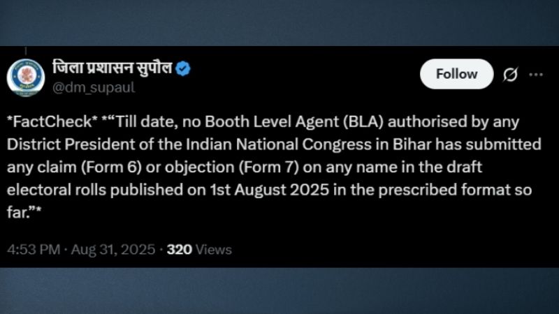 इसी पोस्ट पर सुपौल के DM ने भी स्पष्ट किया कि अब तक कांग्रेस के किसी जिला अध्यक्ष या अधिकृत बूथ लेवल एजेंट (BLA) ने तय फॉर्मेट में न तो फॉर्म-6 भरा है और न ही फॉर्म-7.1756719570.jpg)