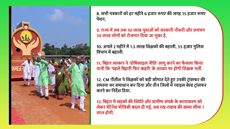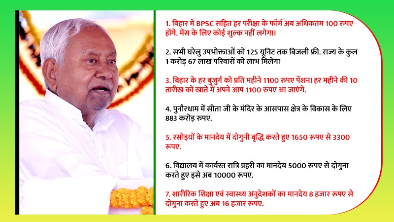 उन्होंने घोषणा की कि उद्योग लगाने वालों को मुफ्त में सरकार जमीन देगी. बिहार से बाहर रहने वाले लोगों को पर्व त्योहार में अपने घर लौटने के लिए सरकार बसें चलाएगी. मुख्यमंत्री ने आगे कहा कि हम लोगों ने महिलाओं के लिए आरक्षण दिया. अब नौकरी में भी उन्हें आरक्षण दे रहे हैं. बिहार पुलिस में महिलाओं की संख्या सबसे अधिक है. इतनी संख्या दूसरे किसी राज्य में नहीं है.