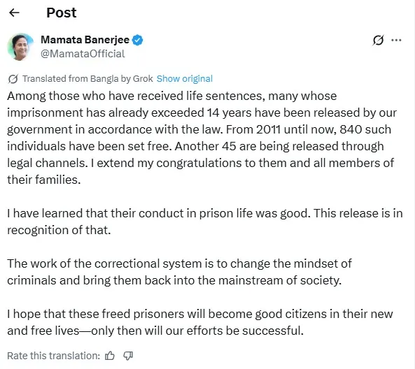 ममता बनर्जी ने कहा, '2011 से अब तक ऐसे 840 लोगों को रिहा किया जा चुका है. 45 और कैदियों को कानूनी तौर पर रिहा किया जा रहा है. मैं उन्हें और उनके परिवारों को बधाई देती हूं.’ उन्होंने सुधार गृहों की पुनर्वास भूमिका पर जोर देते हुए लिखा, ‘मुझे पता है कि कारावास के दौरान उनका व्यवहार अच्छा था. यह रिहाई इसी बात का प्रमाण है.’