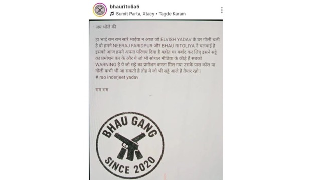 वायरल पोस्ट में लिखा गया है, "जय भोले की हां भाई राम राम सारे भाईया न आज जो ELVISH YADAV के घर गोली चली है वो हमने NEERAJ FARIDPUR और BHAU RITOLIYA ने चलवाई है इसको आज हमने अपना परिचय दिया है बहोत घर बर्बाद कर लिए इसने सट्टे का प्रमोशन कर के और ये जो भी सोशल मीडिया के कीड़े है सबको WARNING है ये जो सट्टे का प्रमोशन करता मिल गया उसके पास कॉल या गोली कभी भी आ सकती है तोह ये जो भी सट्टे आले है तैयार रहो." #raoinderjeet yadav राम राम