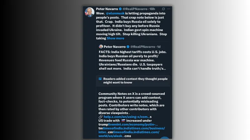 आपको बताएं कि अमेरिकी राष्ट्रपति डोनाल्ड ट्रंप के व्यापार सलाहकार पीटर नवारो भारत के रूसी तेल खरीद को लेकर एक बार फिर अपने विवादित बयानों और तीखी प्रतिक्रियाओं के चलते सुर्खियों में हैं. नवारो ने हाल ही में सोशल मीडिया मंच X पर भारत के खिलाफ एक तथ्यहीन पोस्ट साझा किया, जिसे कम्युनिटी नोट्स ने तुरंत खारिज करते हुए झूठा करार देते हुए उन्हें एक्सपोज कर दिया था. इसके बाद नवारो का पारा हाई हो गया. उन्होंने अपने बेलगाम तोप यानी कि जुबान का रुख X और इसके मालिक एलन मस्क की ओर कर दिया और अपनी गलती स्वीकारने के बजाय उन पर ही हमला बोल दिया.